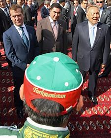 Президент России Дмитрий Медведев (второй слева), президент Туркменистана Гурбангулы Бердымухамедов (в центре) и президент Казахстана Нурсултан Назарбаев (второй справа) на торжественных мероприятиях завершающего этапа ралли "Шёлковый путь-2009".