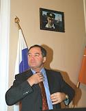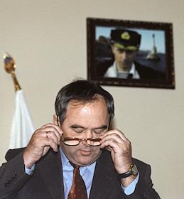 Chairman of the Russian State Fishery Committee (Goskomrybolovstvo) Yevgeny Nazdratenko is interviewed in his office. On the wall behind Mr Nazdratenko hangs a portrait of President Putin in a Navy officer uniform.
