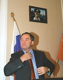 Chairman of the Russian Fishery Committee Yevgeny Nazdratenko is interviewed in his office.