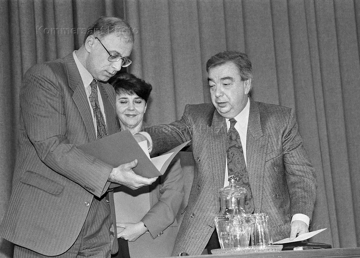 Директор Службы внешней разведки России Евгений Примаков (справа) во время пресс-конференции.