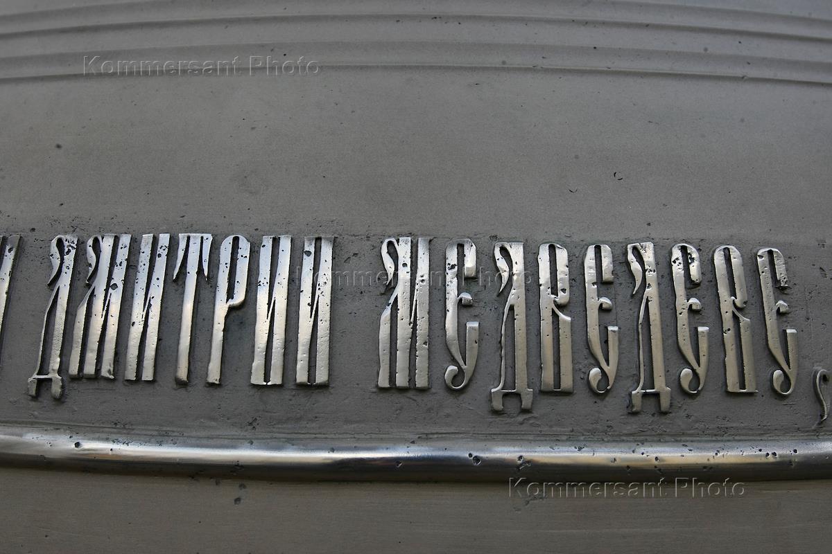Жанровая фотография. Надпись "Дмитрий Медведев" на новом колоколе Звонницы Софийского собора.