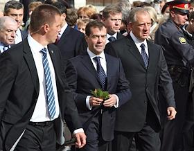 Президент России Дмитрий Медведев (в центре) и губернатор Новгородской области Сергей Митин (справа) во время прогулки на территории Софийского собора .