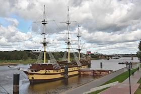 Виды Великого Новгорода. Крупномасштабный фрегат XVIII века - плавучий ресторан - на реке Волхов. Корабль представляет собой копию 66-пушечного фрегата "Святой Апостол".