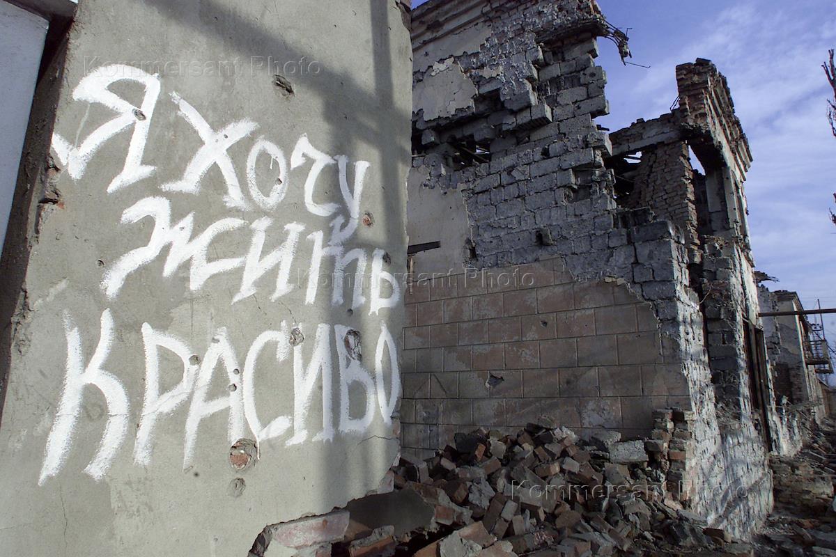 Разрушенный дом на улице Победы. Надпись на стене "Я хочу жить красиво".