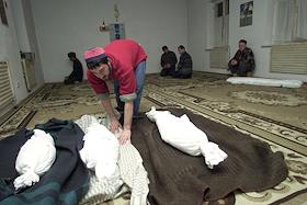 Ритуал погребения сгоревших в палатке городка чеченских беженцев Барт троих мальчиков. Ритуал в мечети по обычаю выполняют не родственники, а добровольцы односельчане.