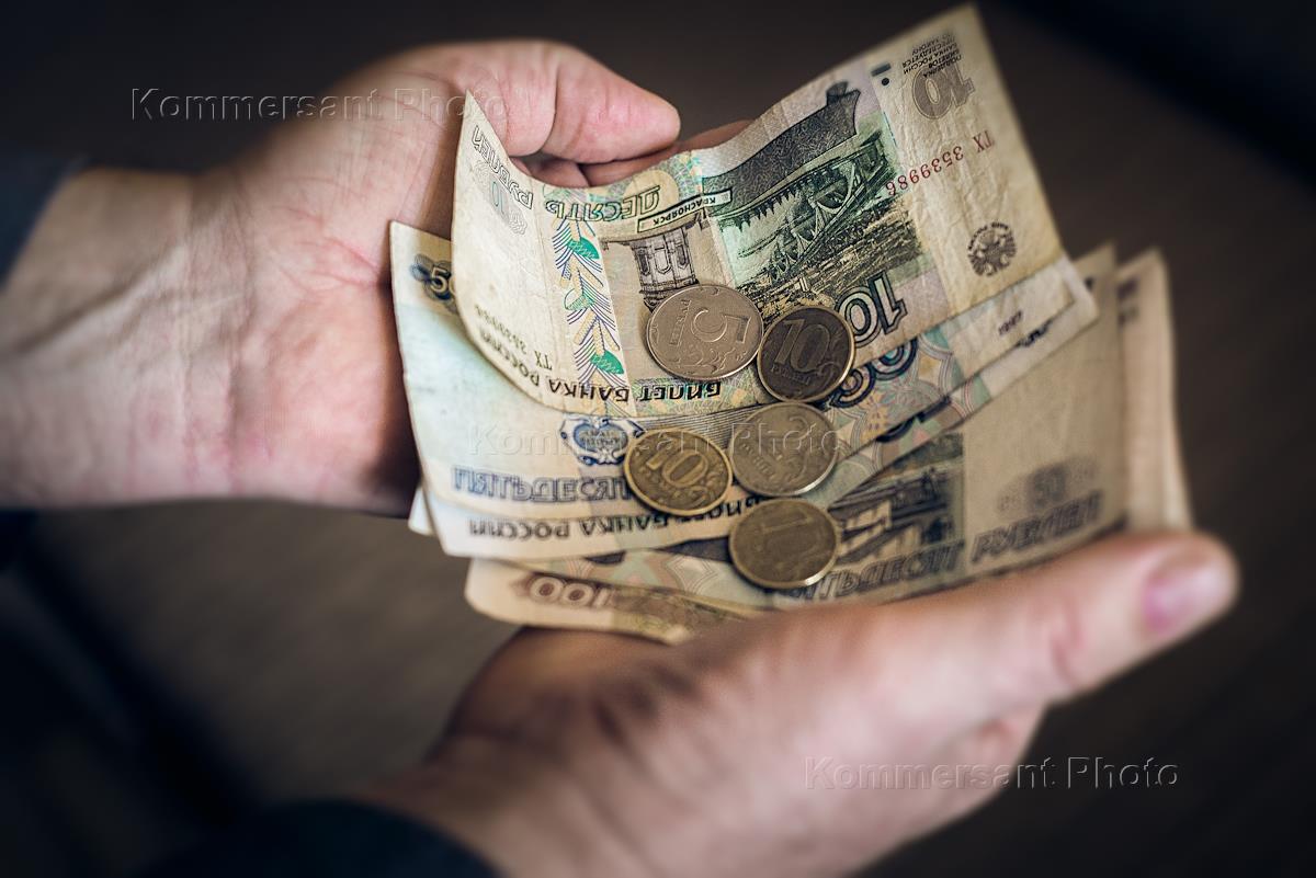 Жанровая фотография. Рублевые монеты, купюры и пенсионное удостоверение в руках пенсионера.