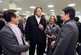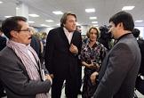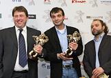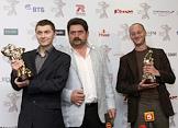 Журналисты Алексей Кудрявцев (слева), Евгений Баранов (справа) и генеральный директор ЗАО Телекомпания "СургутИнформТВ" (СТВ) Игорь Ярош (в центре) на церемонии вручения Национальной телевизионной премии "ТЭФИ -2009" в номинациях "Профессии". Церемония прошла в Центральном доме предпринимателя.