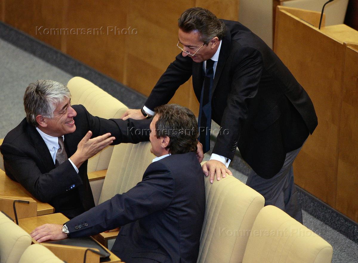 Слева направо: член комитета Государственной думы (ГД)России по безопасности Отари Аршба, член комитета ГД России по физической культуре и спорту Александр Шишкин и член Комитета ГД России по энергетике Валерий Драганов на заседании Госдумы.