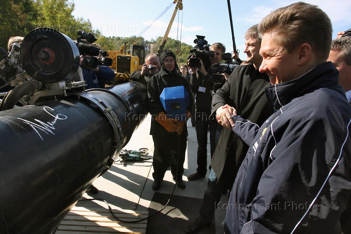 Глава РАО "Газпром" Алексей Миллер (в центре) на торжественных мероприятиях, посвященных сварке первого стыка магистрального газопровода "Джубга - Лазаревское - Сочи". Мероприятия прошли в поселке Джубга Краснодарского края.