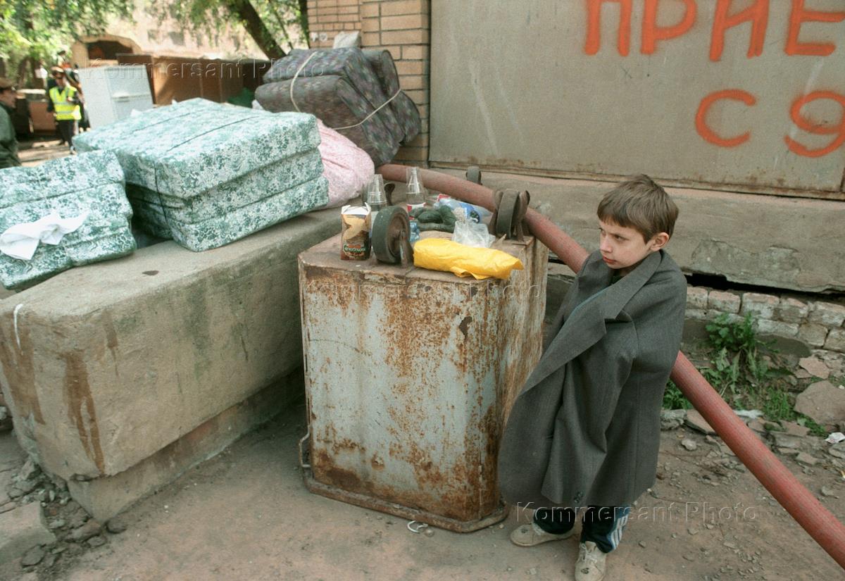 Ребенок среди груды вещей из уцелевших квартир дома № 17 по улице Гурьянова, два подъезда которого были уничтожены в результате террористического взрыва. Согласно официальным данным в результате этого теракта погибло 94 человека.
