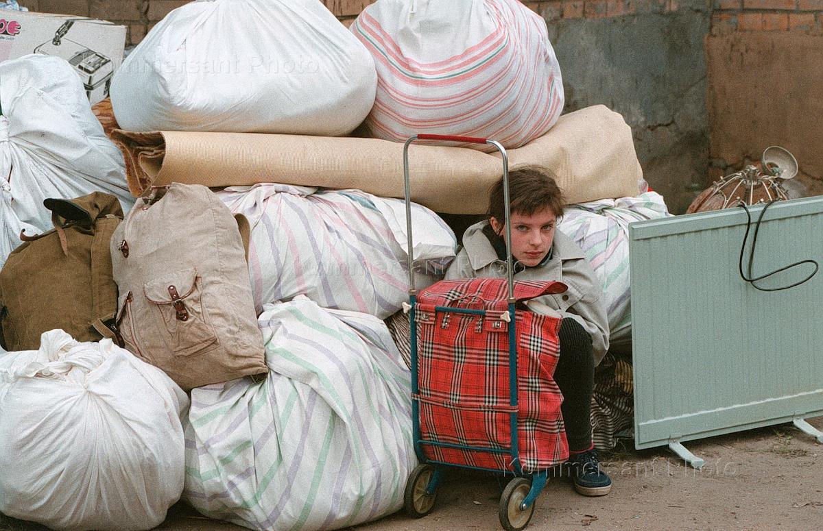 A boy left homeless as the result of an explosion of an apartment building in southern Moscow at waits on the street with his family's belongings. 94 people died in the explosion which police suspect was a terrorist act committed by Chechen separtists.