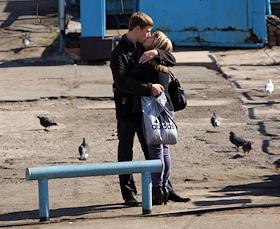 Жанровая фотография. Пара молодых людей целуются в порту Владивостока.