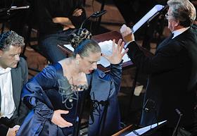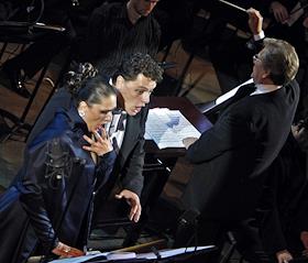 Слева направо: певцы Александр Антоненко, Норма Фантини и дирижер Владимир Федосеев во время исполнения музыкально-поэтической композиции "Легенды о любви" с Большим симфоническим оркестром имени П.И.Чайковского. Выступление прошло в Большом зале Консерватории имени Чайковского.