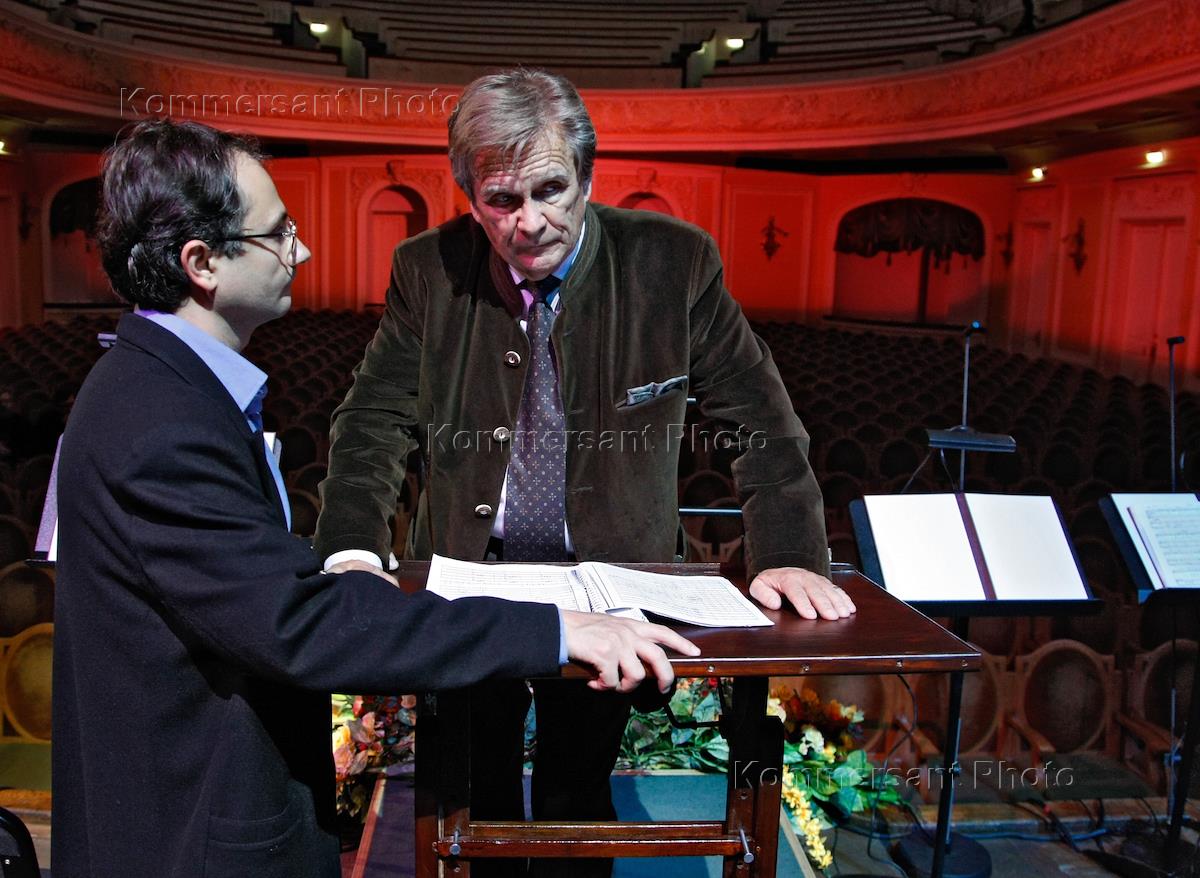 Дирижер Владимир Федосеев (слева) перед началом исполнения музыкально-поэтической композиции "Легенды о любви" с Большим симфоническим оркестром имени П.И.Чайковского. Выступление прошло в Большом зале Консерватории имени Чайковского.