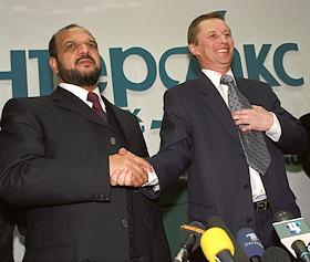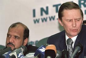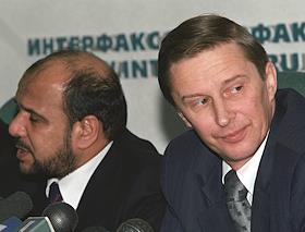 Министр обороны России Сергей Иванов (справа) на совместной пресс-конференции с министром обороны Афганистана генералом армии Моххамадом Касим Фахимом (слева) на тему "Дальнейшее взаимодействие по восстановлению мирной жизни в Афганистане". Пресс-конференция состоялась в центральном офисе агентства "Интерфакс".