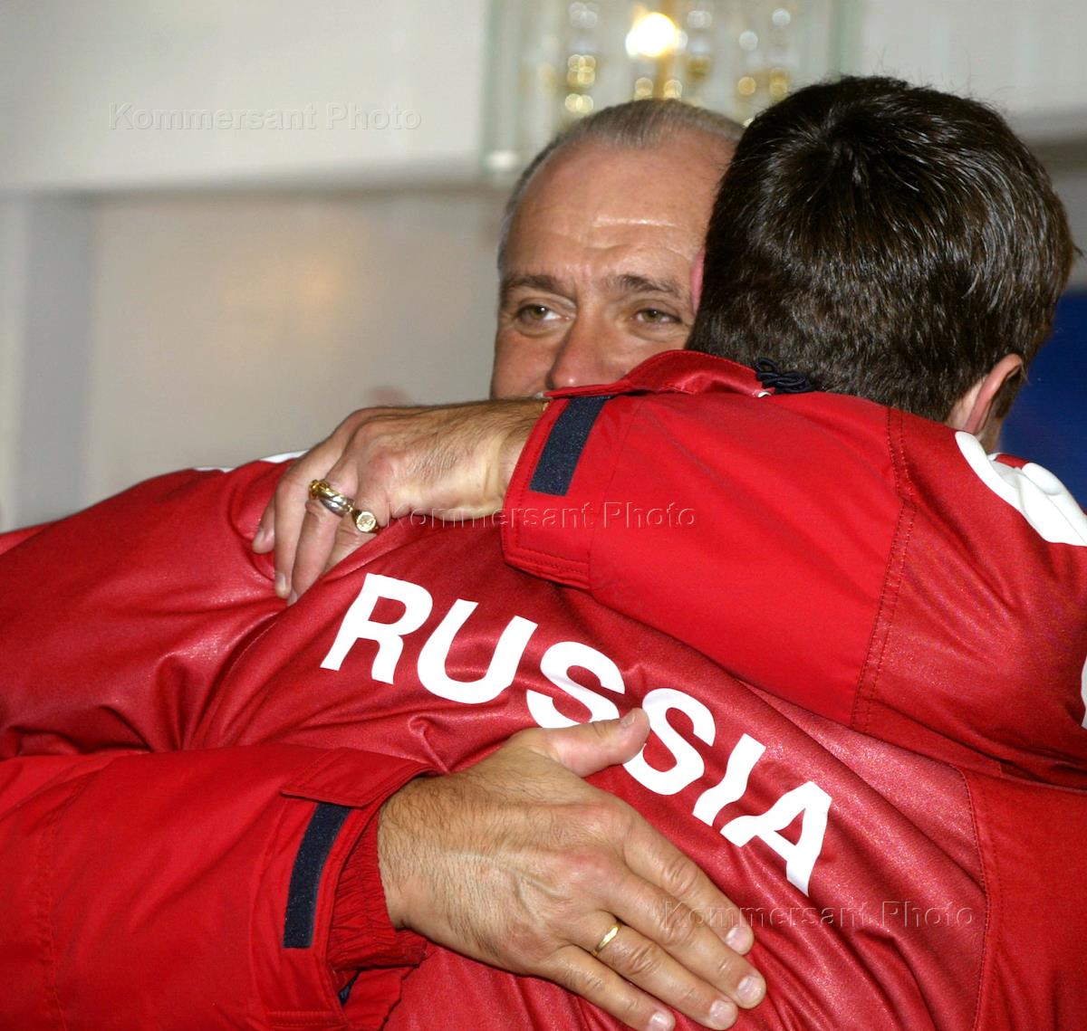 Олимпиада 2002. Олимпийский чемпион в одиночном катании среди мужчин Алексей Ягудин (слева) и президент олимпийского комитета России Леонид Тягачев (справа) во время приема победителей.