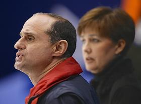 Олимпиада 2002. Тренеры по фигурному катанию Наталья Линичук и Геннадий Карпоносов следят за выступлением своей танцевальной пары на XIX Олимпийских зимних играх.