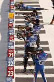 Олимпиада 2002. Соревнования по биатлону в гонке преследования на дистанции 10 км. Участники гонки на огневом рубеже на XIX Олимпийских зимних играх.