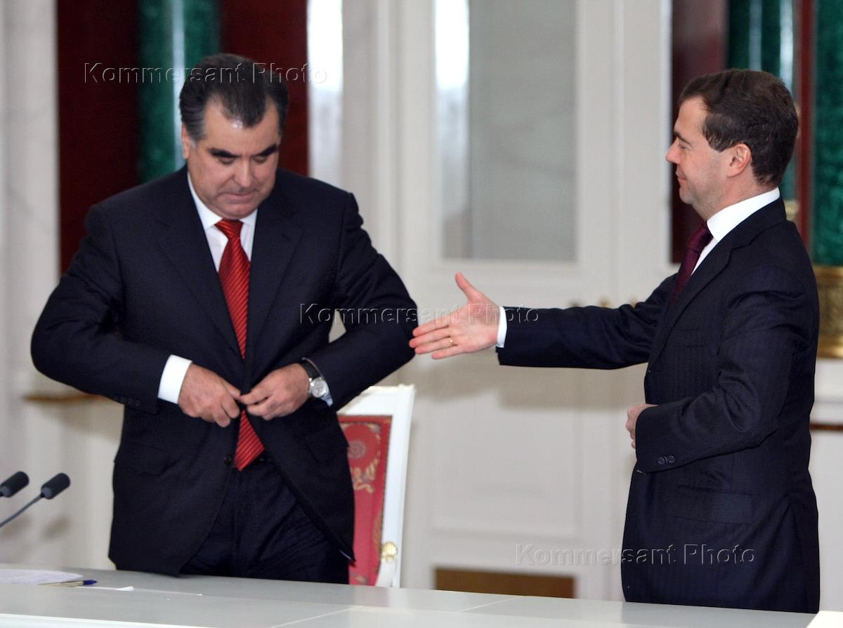 Президент Таджикистана Эмомали Рахмон (слева) и президент России Дмитрий Медведев (справа) во время встречи в Кремле.