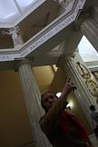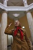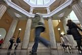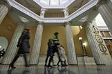 Фойе станции метрополитена "Курская". Пожилая женщина на фоне надписи на фронтоне "И Ленин великий...".
