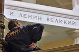 Фойе станции метрополитена "Курская". Сотрудник охраны метрополитена на фоне надписи на фронтоне "И Ленин великий...".
