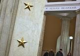 Фойе станции метрополитена "Курская". Надпись на фронтоне "Ленин великий нам путь озарил. Нас вырастил Сталин".