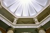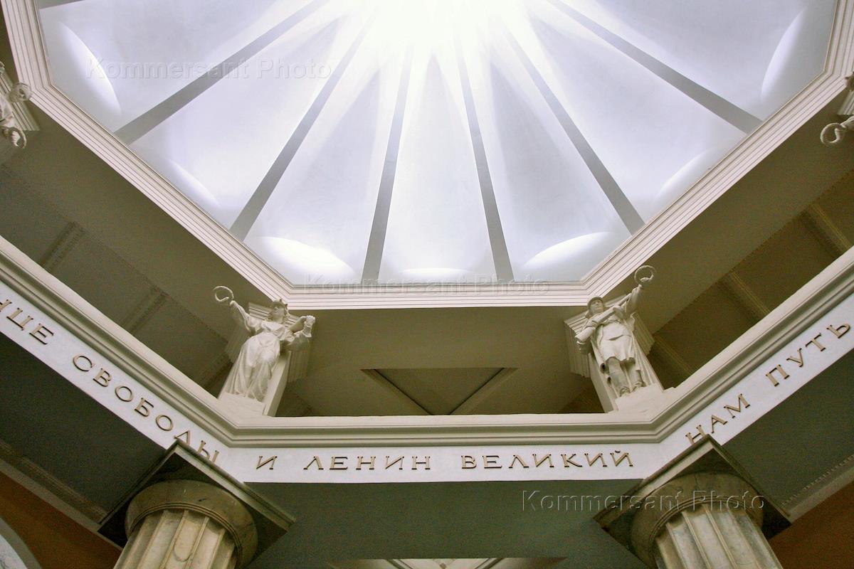 Фойе станции метрополитена "Курская". Надпись на фронтоне "И Ленин великий...".
