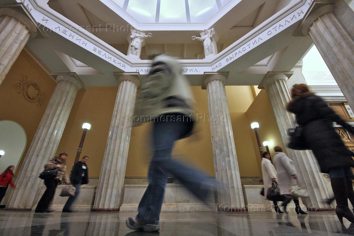 Фойе станции метрополитена "Курская". Надпись на фронтоне "Сталин".