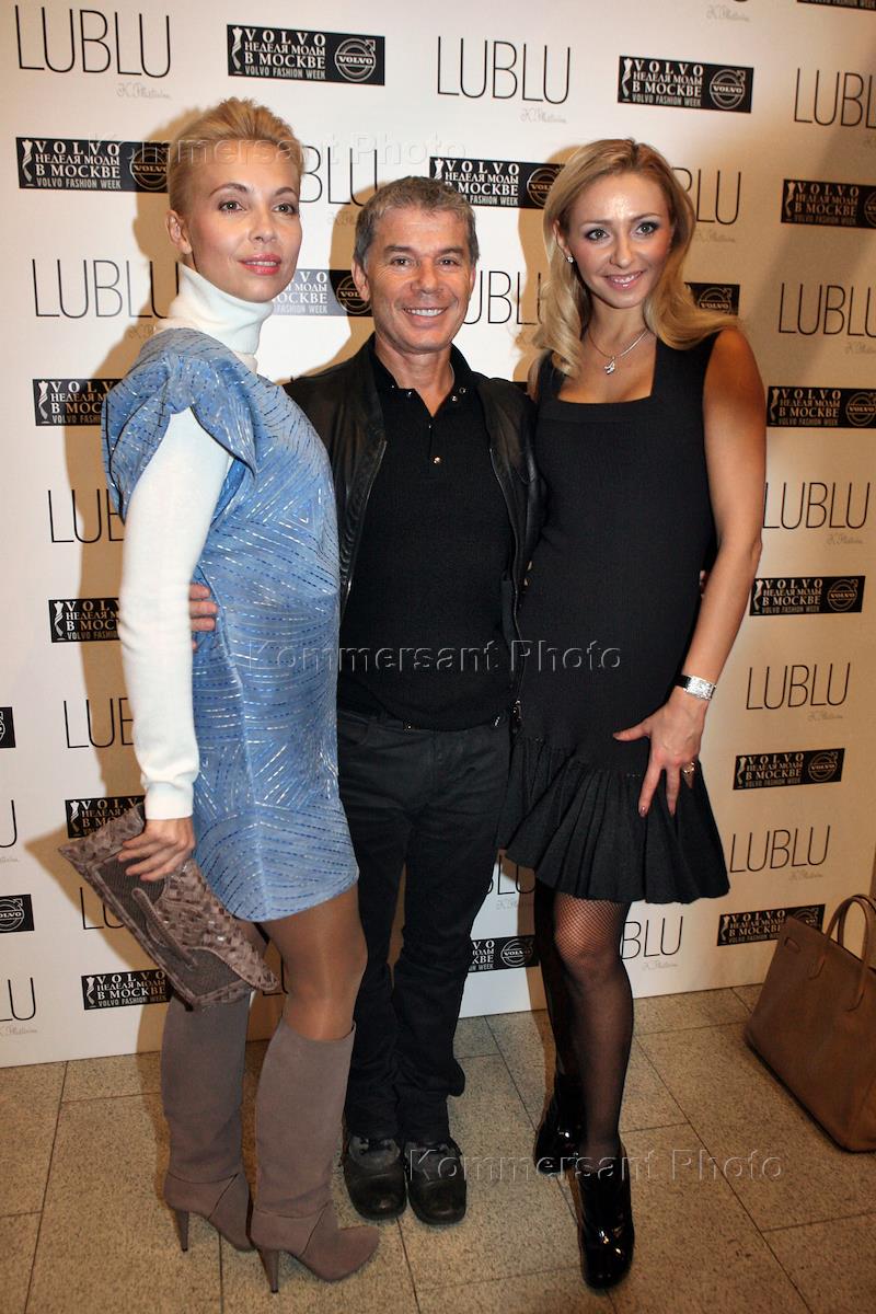 Volvo Fashion Week in Moscow. From the left to right: the wife of singer Oleg Gazmanov Marina, singer Oleg Gazmanov and Olympic champion in figure skating Tatiana Navka at the fashion designer Kira Plastinina's new collection show in Gostiny dvor.