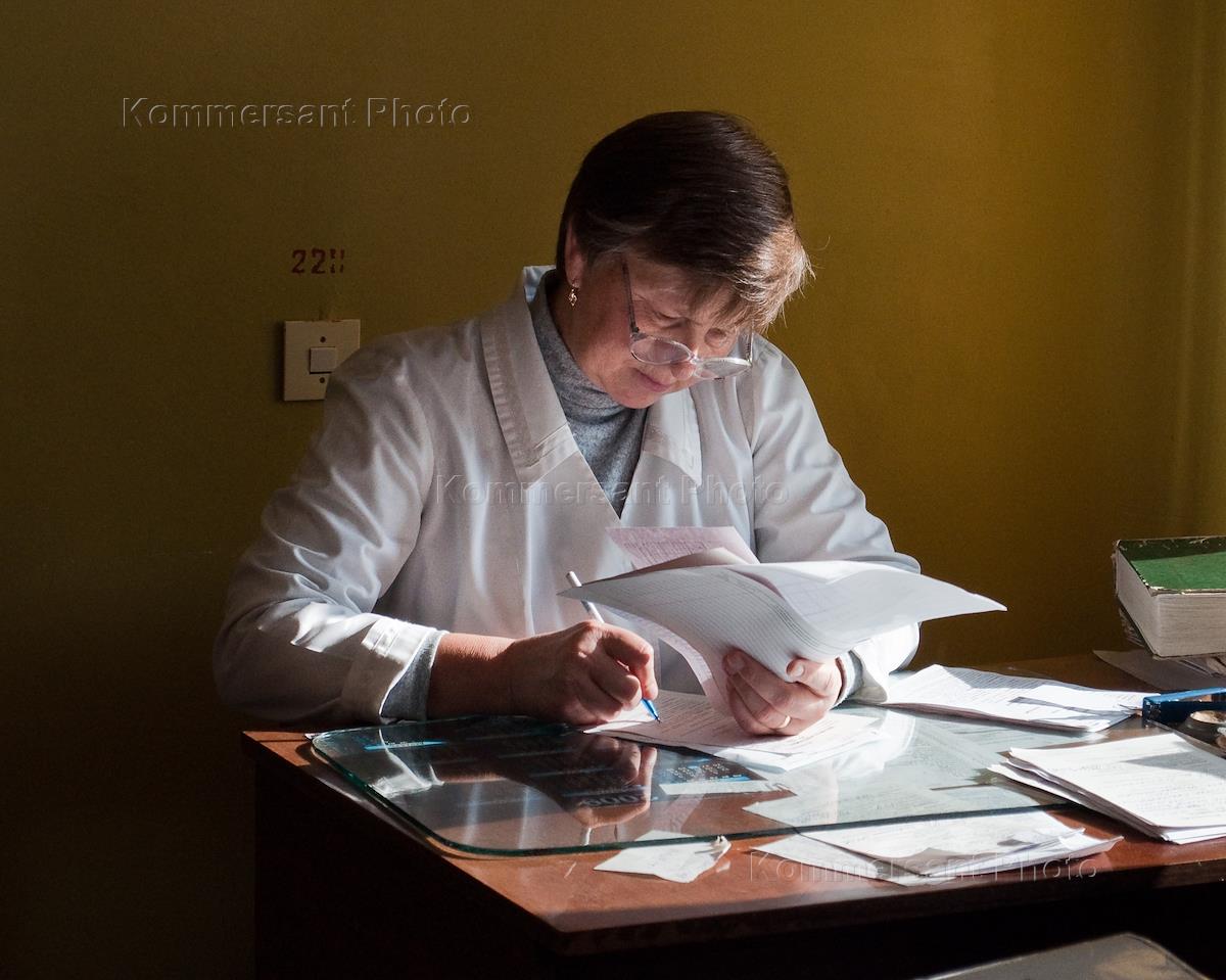 Центральная районная больница в селе Каширское. Врач делает запись в медицинской карточке пациента.