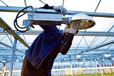Тепличный комплекс "Подосинки", построенный по новейшей технологии совместно с голландскими компаниями Bulneth и Dalsem Horticyltyral Projects. Рабочий меняет лампу дневного света.