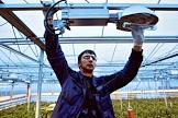 Тепличный комплекс "Подосинки", построенный по новейшей технологии совместно с голландскими компаниями Bulneth и Dalsem Horticyltyral Projects. Рабочий процесс в теплицах. Рабочий меняет лампу дневного света.