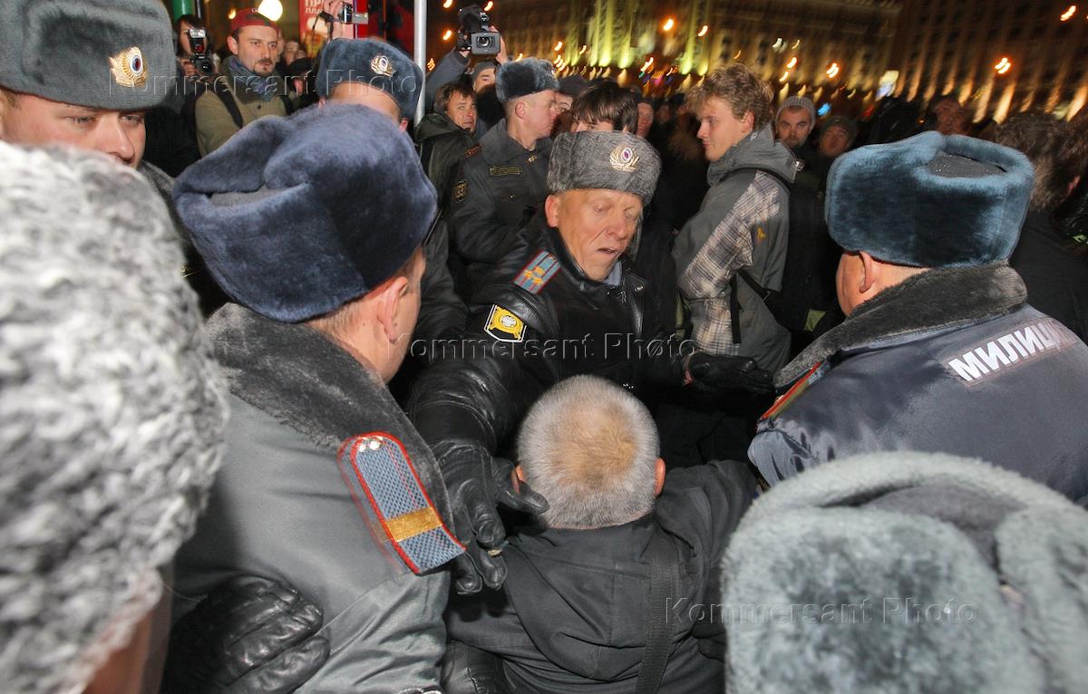 Сотрудники милиции во время задержания участников акции "Митинг несогласных", организованной российскими оппозиционерами и правозащитниками в защиту свободы собраний. Акция прошла на Триумфальной площади.