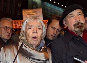 Председатель Московской Хельсинкской группы Людмила Алексеева (вторая справа) и правозащитник Валерий Борщев (справа) во время акции "Митинг несогласных", организованной российскими оппозиционерами и правозащитниками в защиту свободы собраний. Акция прошла на Триумфальной площади.