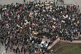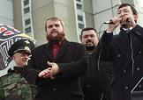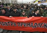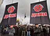 Полковник Владимир Квачков (второй справа) и координатор Центрального Совета (ЦС) Движения против нелегальной иммиграции (ДПНИ) Александр Белов (Поткин) (справа) во время проведения акции "Русский марш". Акция, организованная ДПНИ прошла у станции метро "Люблино".