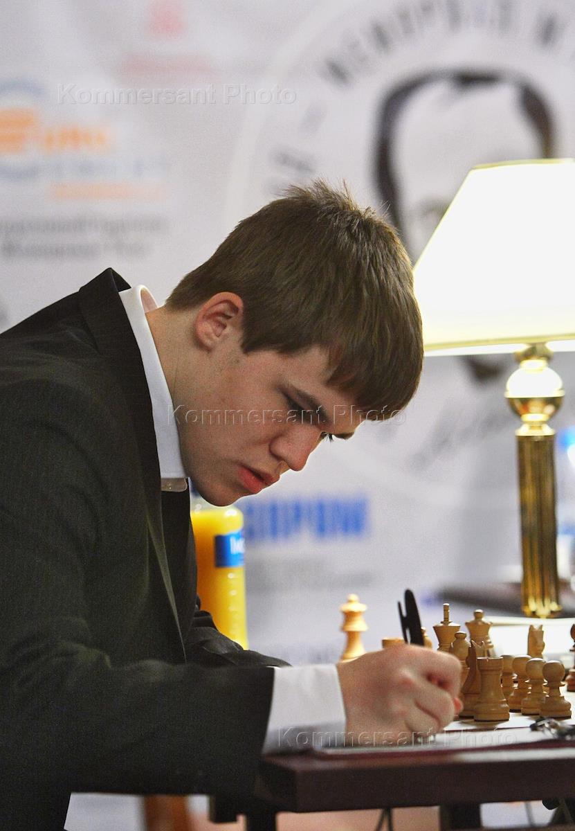 Норвежский шахматист Магнус Карлсен (слева) и российский шахматист Владимир Крамник (справа) во время IV шахматного турнира "Мемориал Михаила Таля".