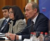 Министр экономического развития России Эльвира Набиуллина (слева) и председатель правительства России Владимир Путин (справа) на заседании Консультативного совета по иностранным инвестициям в Россию в отеле "Балчуг Кемпински".