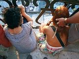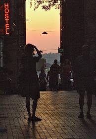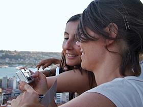 Девушки-туристки любуются видом города и звонят по мобильному телефону.