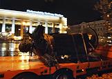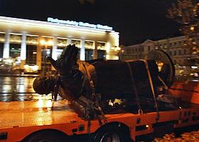 Поврежденный памятник Владимиру Ленину увозят с площади перед Финляндским вокзалом на реставрацию. Памятник был взорван 1 апреля, в результате сзади образовалась дыра около 1 метра в диаметре.