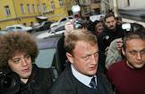 Майор милиции Алексей Дымовский (в центре) перед началом пресс-конференции "Майор милиции из Новороссийска ищет справедливости в Москве против беззакония региональный милицейских чинов". Пресс-конференция прошла в Независимом пресс-центре.