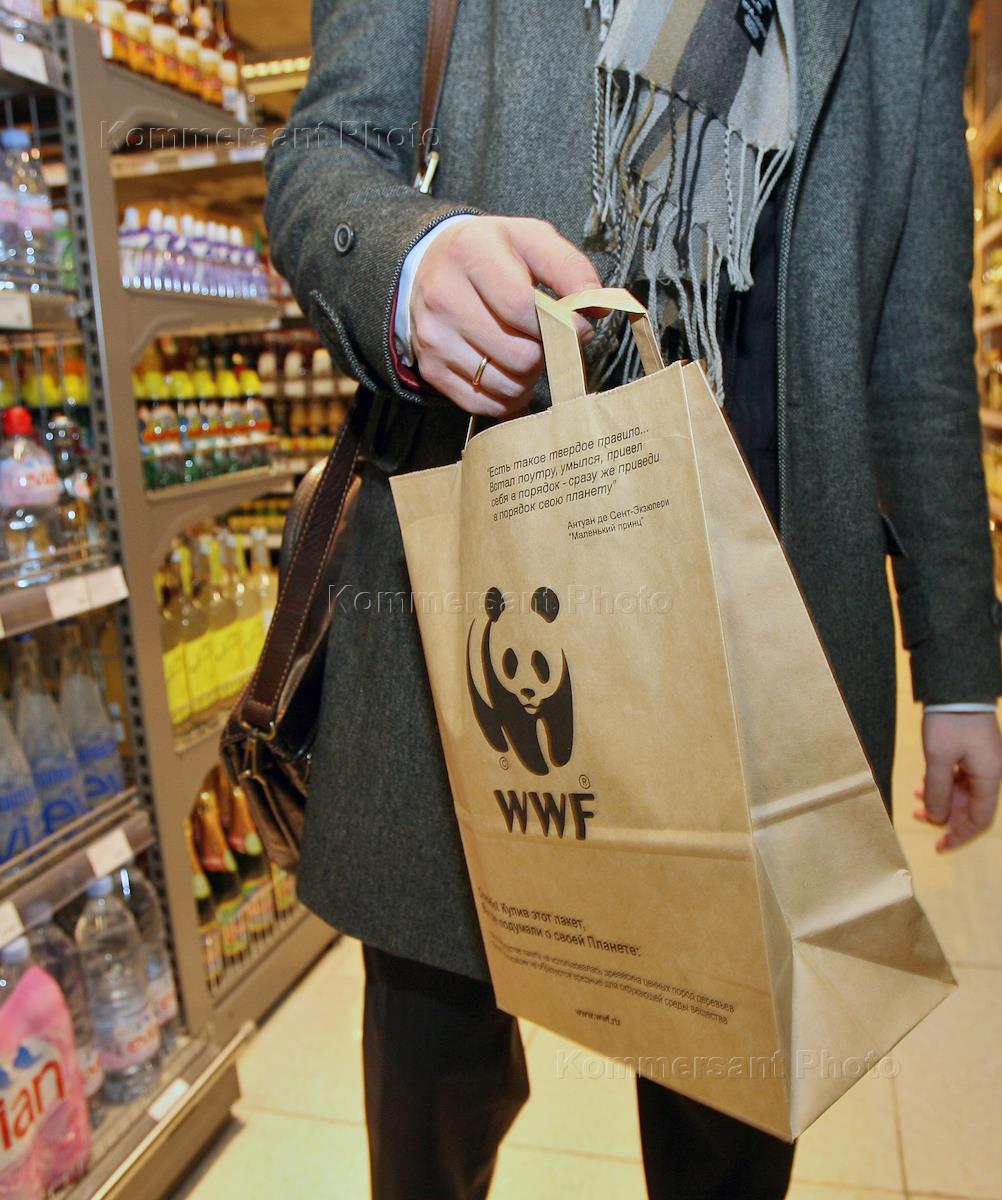 Покупатель с бумажным пакетом в супермаркете сети "Азбука вкуса" в ТЦ "Лотте Плаза".