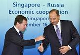 Саммит Азиатско-тихоокеанского экономического сотрудничества (АТЭС). Председатель Внешэкономбанка Владимир Дмитриев (справа) во время встречи президента России Дмитрия Медведева (слева) с представителями деловых кругов России и Сингапура.