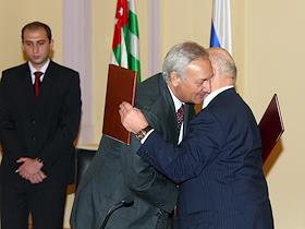 Президент Абхазии Сергей Багапш (в центре) и мэр Москвы Юрий Лужков (справа) на церемонии подписания соглашения о сотрудничестве в торгово-экономической, научно-технической и гуманитарно-культурной областях между правительствами Абхазии и Москвы.