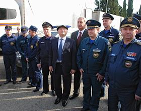 Президент Абхазии Сергей Багапш (в центре) на церемонии официальной передачи Абхазии гуманитарного груза. Церемония прошла на Площади Свободы.