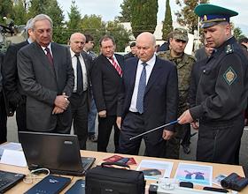 Президент Абхазии Сергей Багапш (слева) и мэр Москвы Юрий Лужков (в центре) во время посещения расположения российских пограничников.