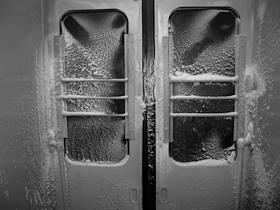Жанровая фотография. Заиндевевшие двери пригородной электрички.