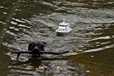Жанровая фотография. Модель катера и собака с палкой в зубах плывут по реке.