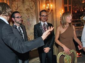 Ресторатор Степан Михалков (второй слева) с супругой Елизаветой Ильиной (слева) и президент компании marka:ff Федор Павлов-Андриевич (в центре) на ужине в честь модельеров Виктора Хорстинга и Рольфа Снерена (справа) (Viktor and Rolf) в ресторане "Турандот".