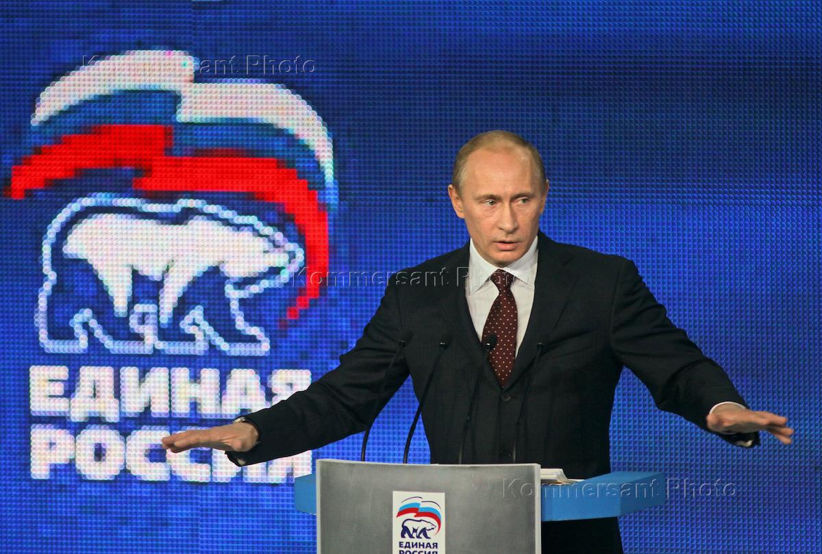 XI Congress of the All-Russian political party "United Russia". From left: Russian Prime Minister Vldaimir Putin, Russian President Dmitry Medvedev, Chairman of the Russian State Duma Boris Gryzlov and Moscow Mayor Yuri Luzhkov before a meeting of the congress at the Lenexpo exhibition complex.