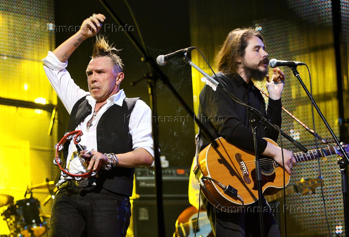 Лидер группы "Неприкасаемые" Гарик Сукачев (слева) и солист группы "Калинов мост" Дмитрий Ревякин (справа) во время выступления на концерте, посвященном 50-летию Гарика Сукачева, в спортивном комплексе "Олимпийский".